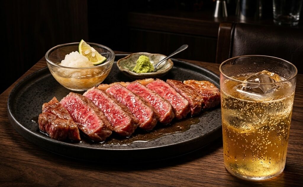 - The Simple Elegance of Fresh Wasabi and Rock Salt More of a garnish than a sauce, yet it is absolute perfection. The exhilarating aroma and sharp bite of freshly grated hon-wasabi, combined with the mineral-rich salinity of rock salt, elevate the meat’s natural sweetness to its absolute peak.