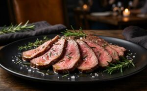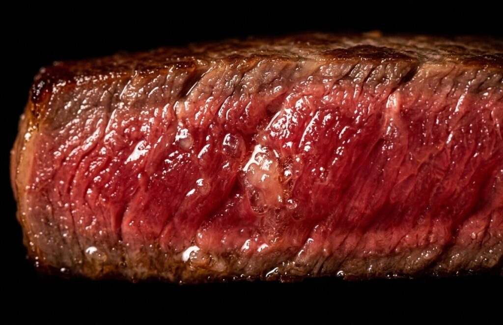 - Searing & Finishing (Searing): After the water bath, the meat is already a perfect medium-rare. Remove it from the bag and once again wipe the surface moisture completely dry. Now, for the first time, season generously with high-quality rock salt and black pepper. Place beef tallow in a heavy iron skillet heated until smoking and sear the meat. Sear for only 30 seconds per side. This instantly caramelizes the surface proteins (Maillard reaction) to create a fragrant, flavorful crust. Wrap immediately in aluminum foil and let it rest for 5 minutes to allow the juices to settle before cutting.