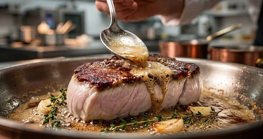 極上バターを使った「仕上げのアロゼ」。しかし、この魔法が最大限に活きるかどうかは、事前の「完璧な火入れ(芯温管理)」にかかっています。